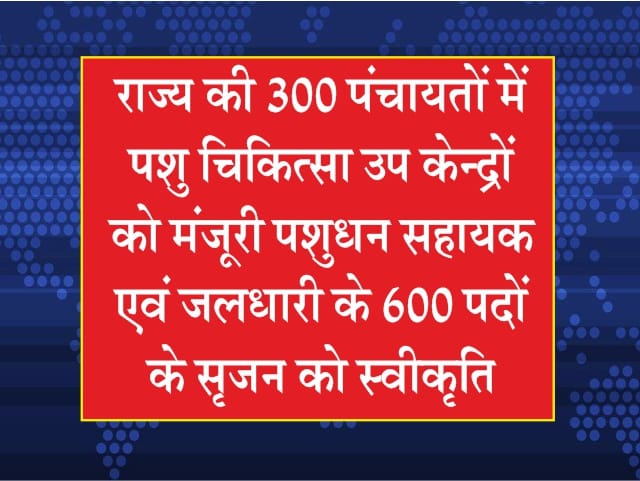 राज्य की 300 पंचायतों में पशु चिकित्सा उप केन्द्रों को मंजूरी पशुधन सहायक एवं जलधारी के 600 पदों के सृजन को स्वीकृति