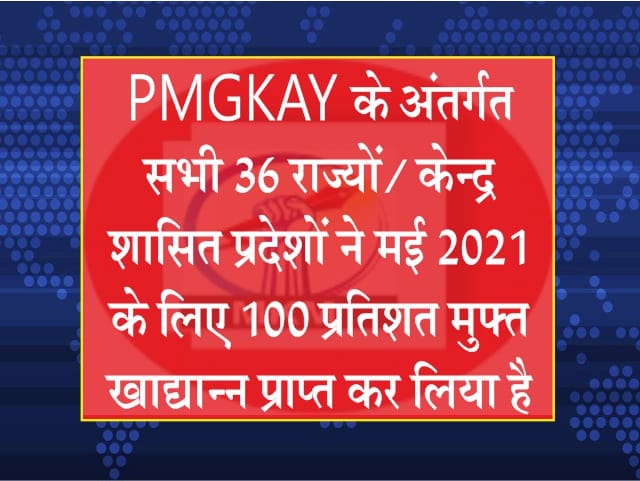 प्रधानमंत्री गरीब कल्याण अन्न योजना दीपावली तक के लिए बढ़ाई गई FCI ने PMGKAY के तहत सभी राज्यों/ केन्द्र शासित प्रदेशों को 69 एलएमटी मुफ्त खाद्यान्न की आपूर्ति की PMGKAY के अंतर्गत सभी 36 राज्यों/ केन्द्र शासित प्रदेशों ने मई 2021 के लिए 100 प्रतिशत मुफ्त खाद्यान्न प्राप्त कर लिया है पूर्वोत्तर राज्यों अरुणाचल प्रदेश,…