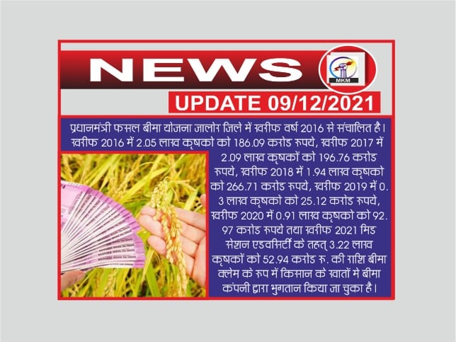 जालोर 9 दिसम्बर। प्रधानमंत्री फसल बीमा योजना के तहत फसल बीमा करवाने की अंतिम तिथि 31 दिसंबर है। कृषक अपने बैंक अथवा नजदीकी जनसेवा केन्द्र के माध्यम से ऋणी अथवा गैर-ऋणी कृषक के रूप में अपनी फसल का बीमा करवा सकते है। कृषि विभाग के उपनिदेशक डॉ आर बी सिंह ने बताया कि प्रधानमंत्री फसल…