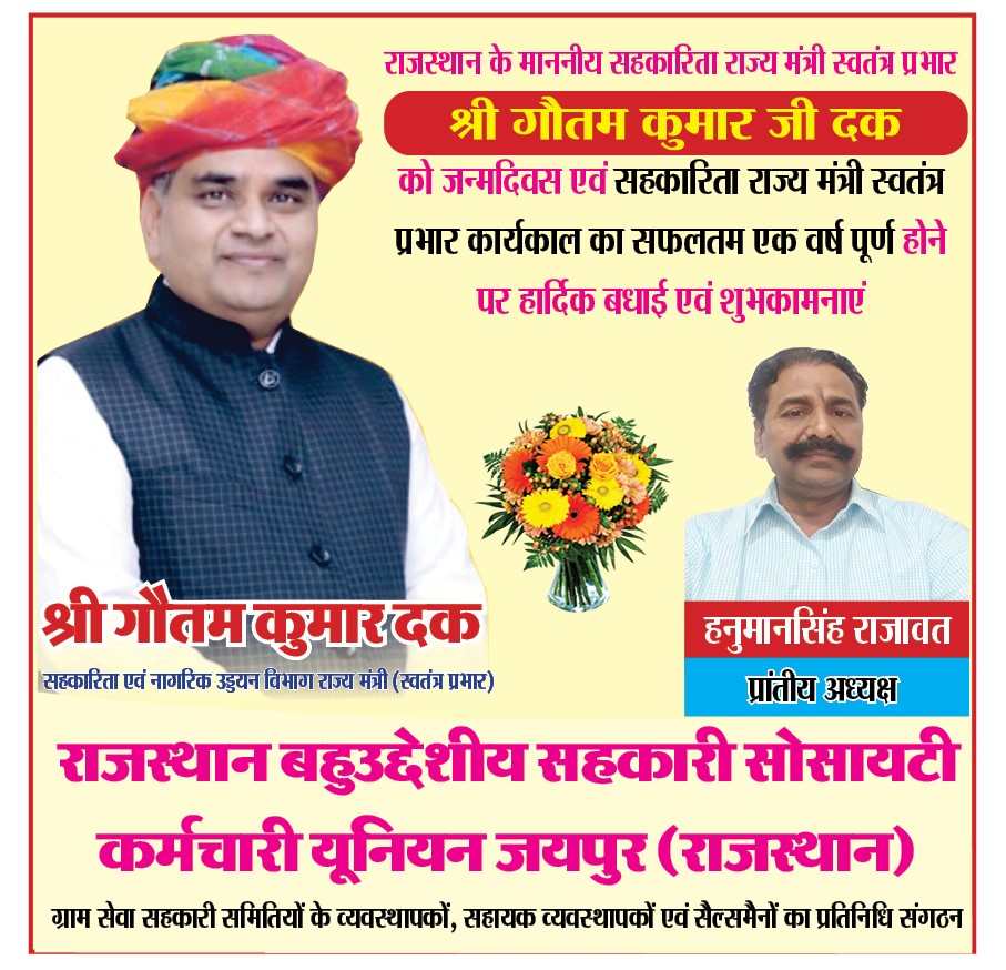 जयपुर । डिजिटल डेस्क | 16 दिसम्बर | प्रदेश में ग्राम सेवा सहकारी समितियों (Pacs) एवं वृहत कृषि बहुउद्देशीय सहकारी समितियों (Lamps) में कार्यरत कर्मचारियों को प्रदेश स्तर पर प्रतिनिधित्व करने वाले राजस्थान बहुउद्देशीय सहकारी सोसायटी कर्मचारी यूनियन जयपुर (RMCSEU) ने राज्य सरकार में सहकारिता राज्य मंत्री (स्वतंत्र प्रभार) गौतम कुमार दक का एक साल पूर्ण होने एवं उनके जन्मदिवस के अवसर पर शुभकामनाएं दी हैं, यह शुभकामनाएं यूनियन के प्रांतीय अध्यक्ष हनुमानसिंह राजावत ने दी हैं,