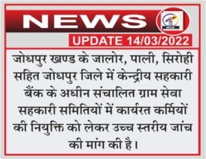 जोधपुर । डिजिटल डेस्क । 14 फरवरी । जोधपुर खण्ड के जालोर, पाली, सिरोही सहित जोधपुर जिले में केन्द्रीय सहकारी बैंक के अधीन संचालित ग्राम सेवा सहकारी समितियों में कार्यरत कर्मियों की नियुक्ति को लेकर उच्च स्तरीय जांच की मांग की है।