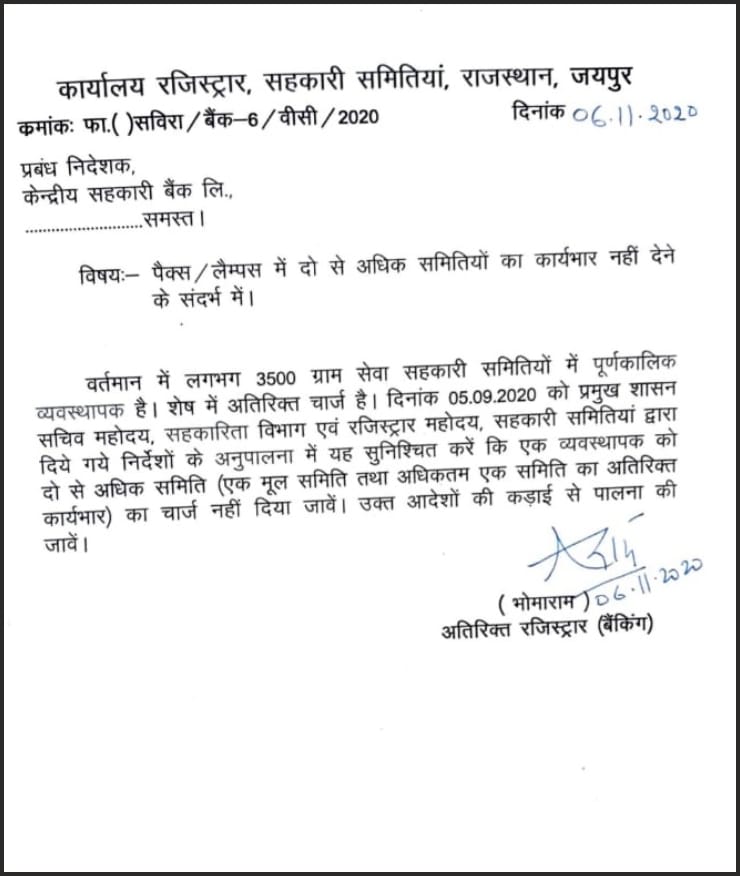 जोधपुर 14 सितम्बर 2021 ! डिजिटल डेस्क ! . सहकारिता विभाग व केन्द्रीय सहकारी बैंक के अधीन संचालित जिले की कई ग्राम सेवा सहकारी समितियां में इन दिनों व्यवस्थापक पद अतिरिक्त चार्ज के भरोसे संचालित हैं। जिले में संचालित करीब 276 ग्राम सेवा सहकारी समितियों में से अधिकतर सहकारी समितियों का कार्यभार राजनीतिक संरक्षण वाले व्यवस्थापक/अनियमितकरण-अस्थाई सेल्समेनों को व्यवस्थापक पद का अतिरिक्त कार्यभार दिया हुआ है । हालांकि रजिस्ट्रार सहकारी समितियां, जयपुर ने एक पत्र जारी कर केन्द्रीय सहकारी बैकों के समस्त प्रबंध निदेशक को निर्देशित किया था कि पैक्स/लेम्प्स में एक व्यवस्थापक को दो से अधिक समिति ( एक मूल समिति तथा अधिकतम एक समिति का अतिरिक्त कार्यभार ) का चार्ज नहीं दिया जाने के निर्देशों के बावजूद जिले में कई व्यवस्थापकों को 3 से 4 समितियों का चार्ज विभाग द्वारा दे रखा है । सुत्रो के अनुसार नेवरा व्यवस्थापक उमाराम चौधरी को नेवरा, घेवड़ा व भेड़ समितियों में व्यस्थापक के पद का कार्यभार दिया हुआ है । गौरतलब है कि जिले की कई पैक्स सहकारी समितियों में व्यवस्थापकों के रिक्त पदों पर अतिरिक्त कार्यभार कई व्यवस्थापकों को दे रखा है ।