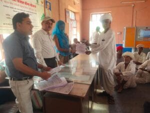 कृषक को बीमा पॉलिसी ग्राम पंचायत में उपस्थित जन प्रतिनिधि यथा सरपंच के हाथों वितरण करवाया गया।
